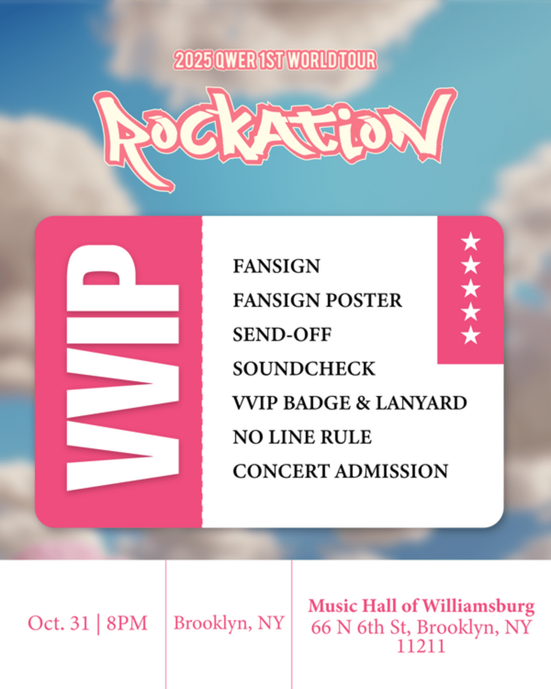October 31, 2025 at Music Hall of Williamsburg. QWER is coming to Brooklyn for their 2025 QWER 1st World Tour: ROCKATION! Don’t miss the chance to see QWER perform fan-favorite songs and create unforgettable memories with special fan...